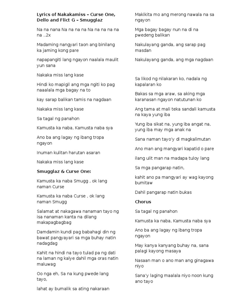 Lyrics to Nakakamiss Lang Kasi by Smugglaz Curse One Dello and Flict G. AZ Lyricsaz - One of the largest LYRICS website. His my god eh god eh.