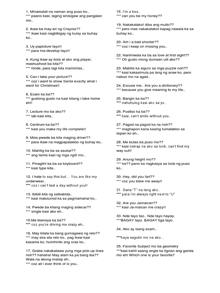 Kasi naghihirap ako kapag wala ka. Spanish Pick Up Lines French Pick Up Lines Indonesian Pick Up Lines Clean Jokes Travel Pick Up Lines. Kasi I cant smile without you.